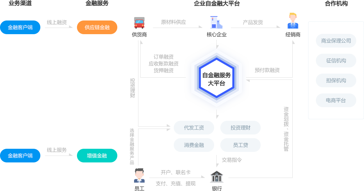 聯合商業保理公司、銀行、財務公司等合作資金方以及第三方征信和擔保等機構提供增值服務,合作共贏